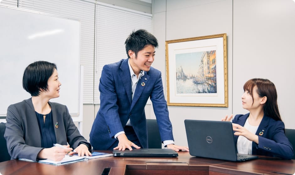 お客様先への提案内容を振り返りつつ、次回の提案に向けた課題の整理やスケジュールを上司や先輩と相談しながらミーティング。